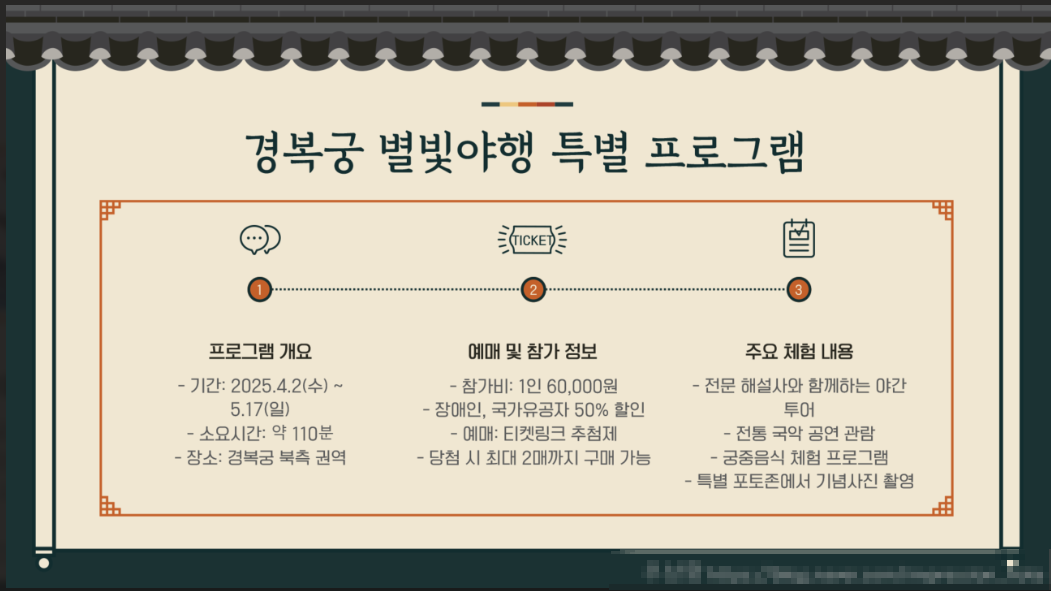 경복궁은 그 자체로 한국의 역사와 문화를 느낄 수 있는 공간입니다. 이번 기회를 통해 그 매력을 충분히 느껴보길 바랍니다. 즐거운 관람 되세요!