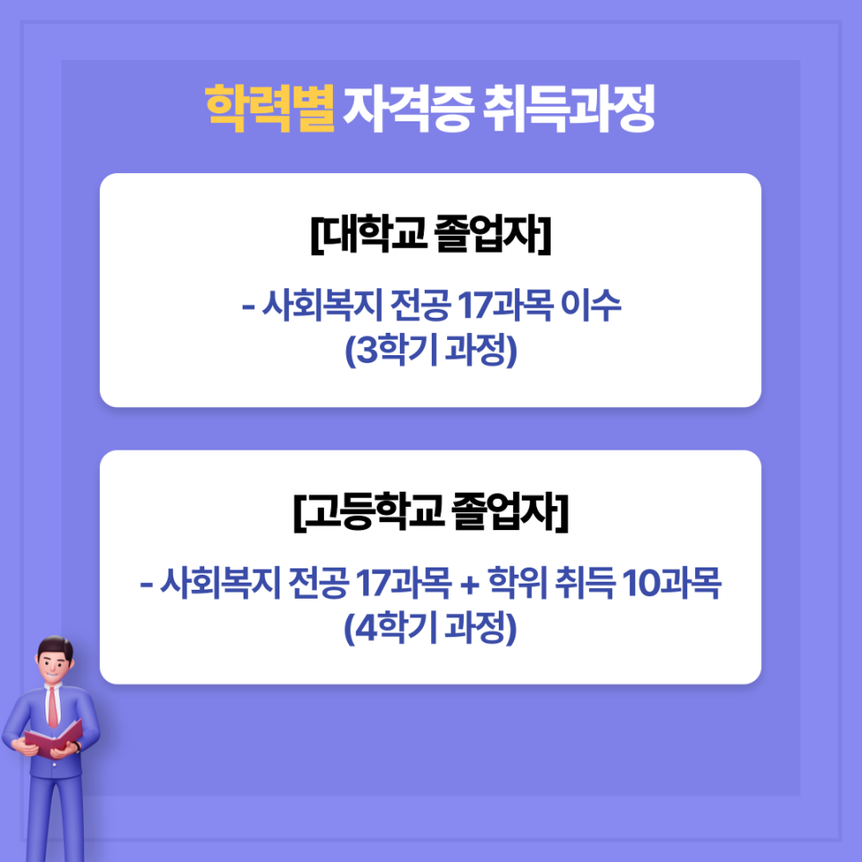 - 전공 과목 이수: 사회복지 관련 17과목(51학점) 이수