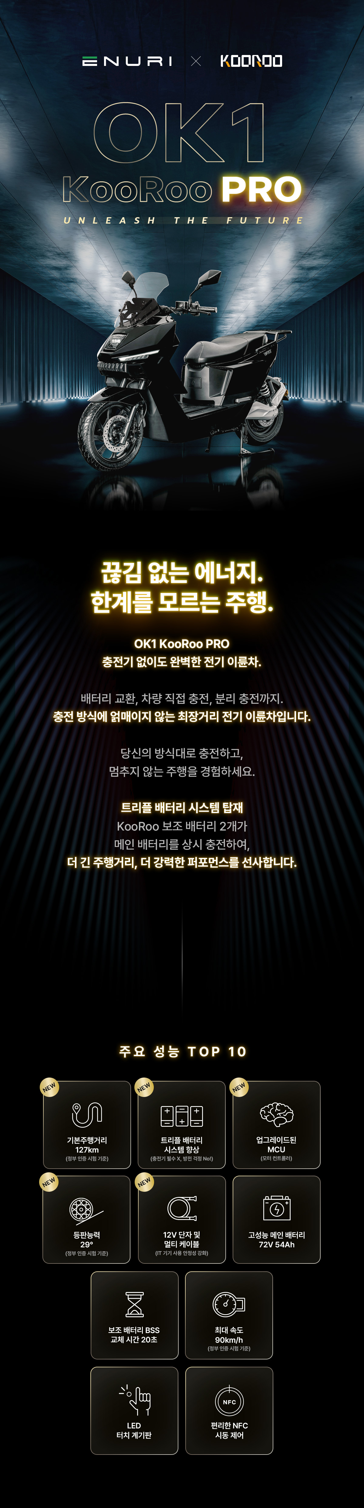 이누리 OK1 쿠루 전기스쿠터는 합리적인 가격, 뛰어난 성능, 편리한 배터리 교체 시스템, 다양한 편의 기능으로 전기스쿠터 시장에 새로운 바람을 일으키고 있습니다. 2024년 8월 26일부터 시작된 사전예약으로 정부 보조금과 블루투스 헤드셋 증정 혜택까지 누릴 수 있습니다. 지금 이누리 공식 사이트에서 사전예약하고 스마트하고 친환경적인 모빌리티를 경험하세요!